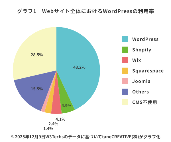 しかしながら、世界ではそれより早くWordPressが主流となってきており、W3Techsによれば、本記事を改訂している2025年12月9日時点で、世界中のWebサイトの約43.2%がWordPressで構築されているとのことです(グラフ1参照)。