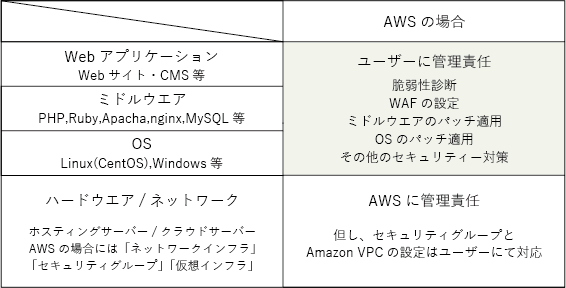 特に、AWSのようなクラウドサーバーでは、ミドルウェアやOS、クラウドサーバーの一部の設定についてもユーザー側に管理責任が分配されていることから、これらについてもバージョンアップ、適切な管理等の保守管理を実施する必要があります。