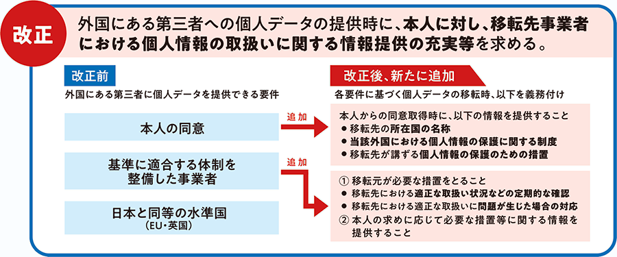 また、②基準に適合する体制を整備した事業者への提供であっても、「移転先における適正な取り扱い状況などの定期的な確認」や「移転先における適正な取り扱いに問題が生じた場合の対応を定める」など移転元が必要な措置をとること、本人の求めに応じて必要な措置等に関する情報を提供することが義務化されました。