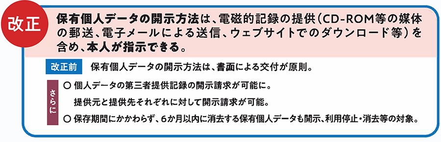 旧法では、ユーザーが個人情報取扱事業者に対して、保有個人データの開示を請求した場合には、その開示は書面による交付が原則とされていましたが、令和2年改正個人情報保護法では、電磁的記録の提供(CD-ROM等の媒体の郵送、電子メールによる送信、Webサイト(ホームページ)でのダウンロード)等、「本人の指定する方法による開示」を請求することができることになりました(個人情報保護法第28条第1項)。