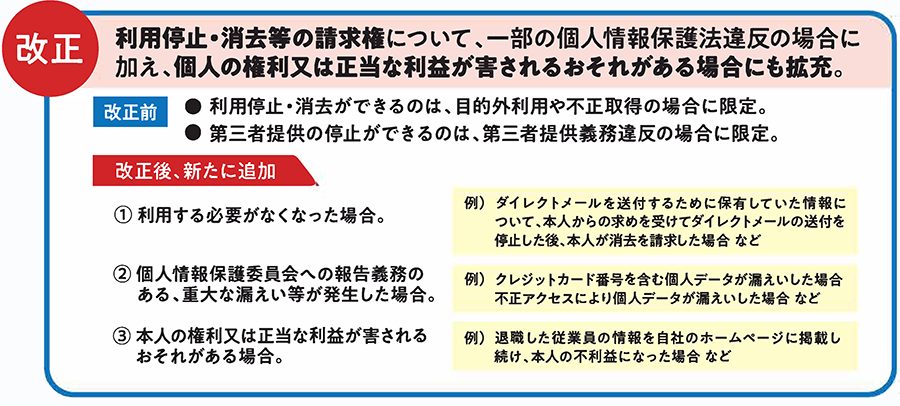 令和2年改正個人情報保護法では、これに加えて、①事業者が、保有個人データを利用する必要がなくなった場合、②個人情報保護委員会への報告義務がある重大な漏えい等が生じた場合、③本人の権利又は正当な利益が害されるおそれがある場合にも、利用停止・消去の停止を請求できるようになりました(個人情報保護法第30条第5項)。