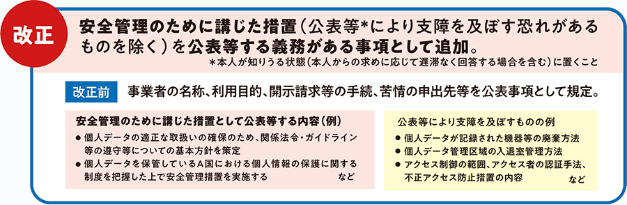 令和2年改正個人情報保護法では、これに加えて、安全管理のために講じた措置も公表事項として規定されました。ただし、例えば不正アクセス防止措置の内容など、公表することで攻撃者に情報を与えてしまう等、公表により支障を及ぼす恐れのあるものは除かれています(個人情報保護法第32条第1項、政令第10条)。