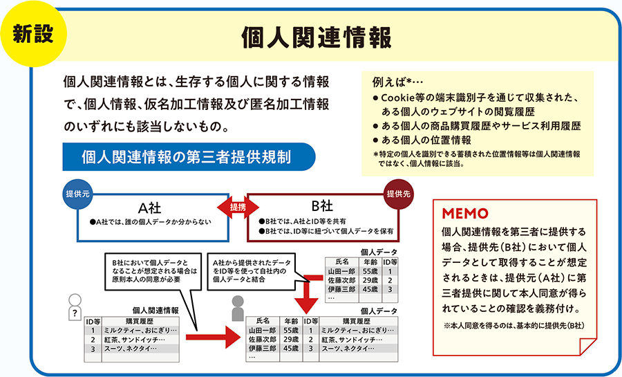 令和2年改正個人情報保護法では、「個人関連情報」を第三者に提供する場合において、提供先の第三者が当該個人関連情報を「個人データ」として取得することが想定される場合には、個人データの第三者提供に準じた規制が課せられ、提供元の個人関連情報取扱事業者は提供先に対して本人の同意が得られていることを確認しなければならないことになりました(個人情報保護法第31条第1項本文)。