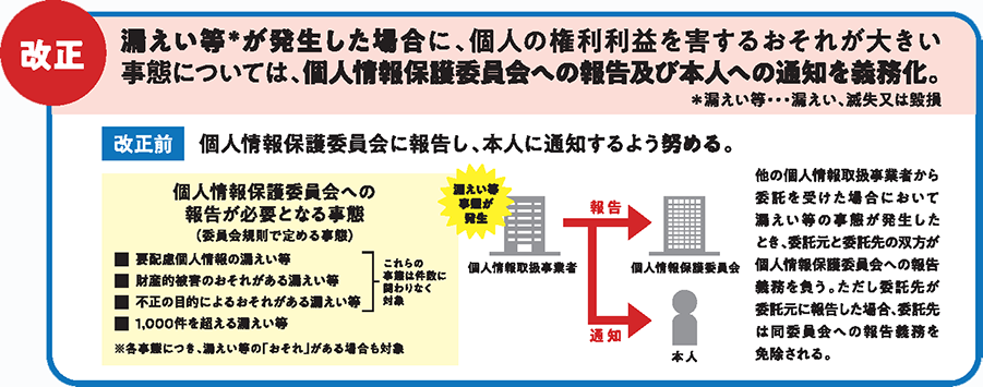 令和2年改正個人情報保護法では、個人の権利利益を害する恐れが大きい漏えい等の事態については、個人情報保護委員会への報告と本人への通知が義務化されました(個人情報保護法第22条の2)。